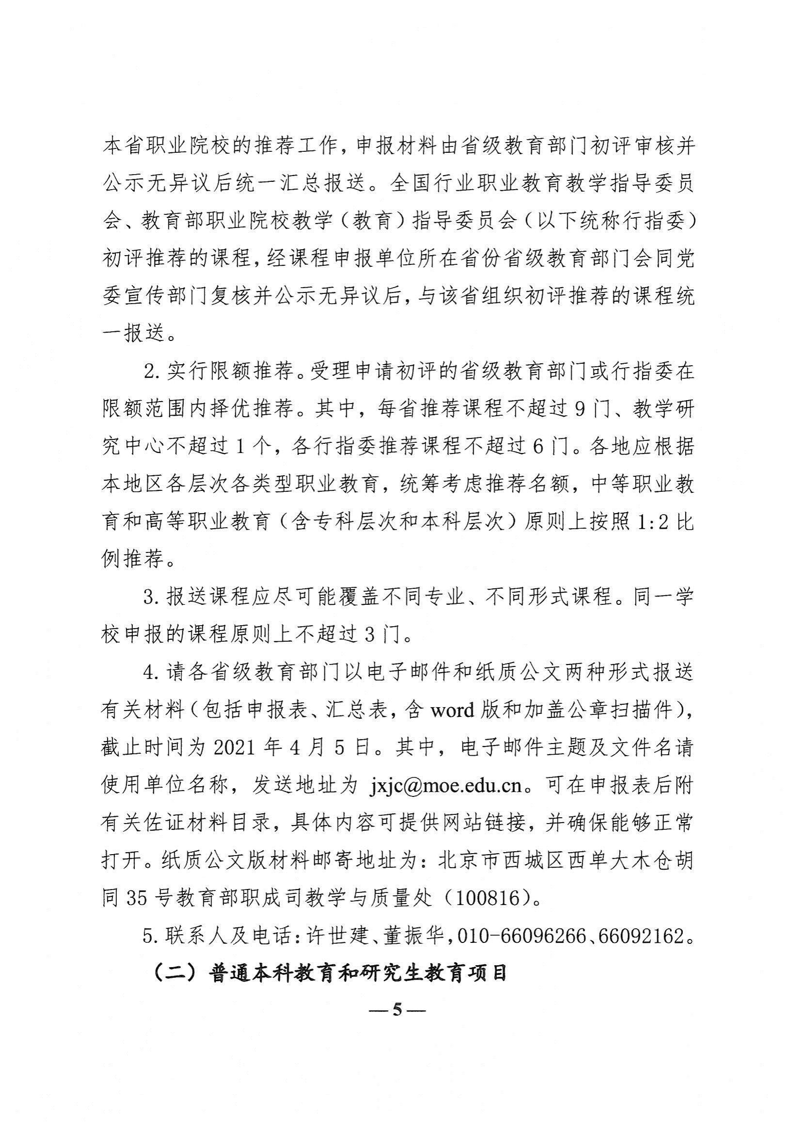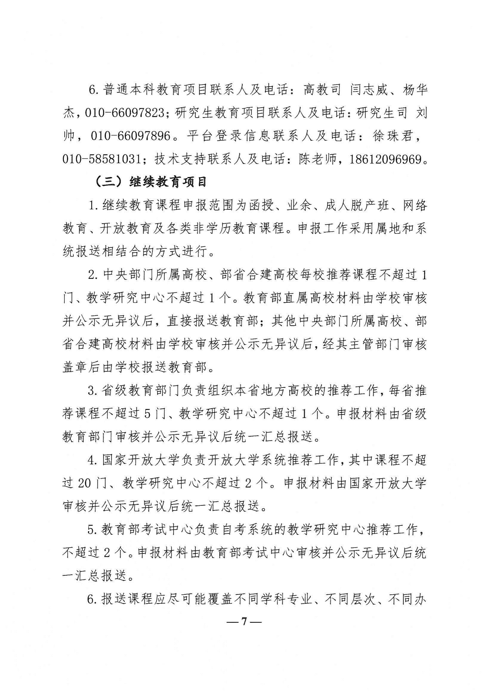 1.举办了继续教育的本科院校向我厅高等教育处申报,高职高专院校、独立设置成人高校向我厅职业教育与成人教育处申报。各校推荐课程、教学研究中心不超过 1 门(个)。我厅将组织专家对各校申报项目进行评审,其中从本科高校推荐课程中评出 3 门,从高职高专院校和独立设置成人高校推荐课程中评出 2 门,公示无异议后统一汇总报送教育部。
