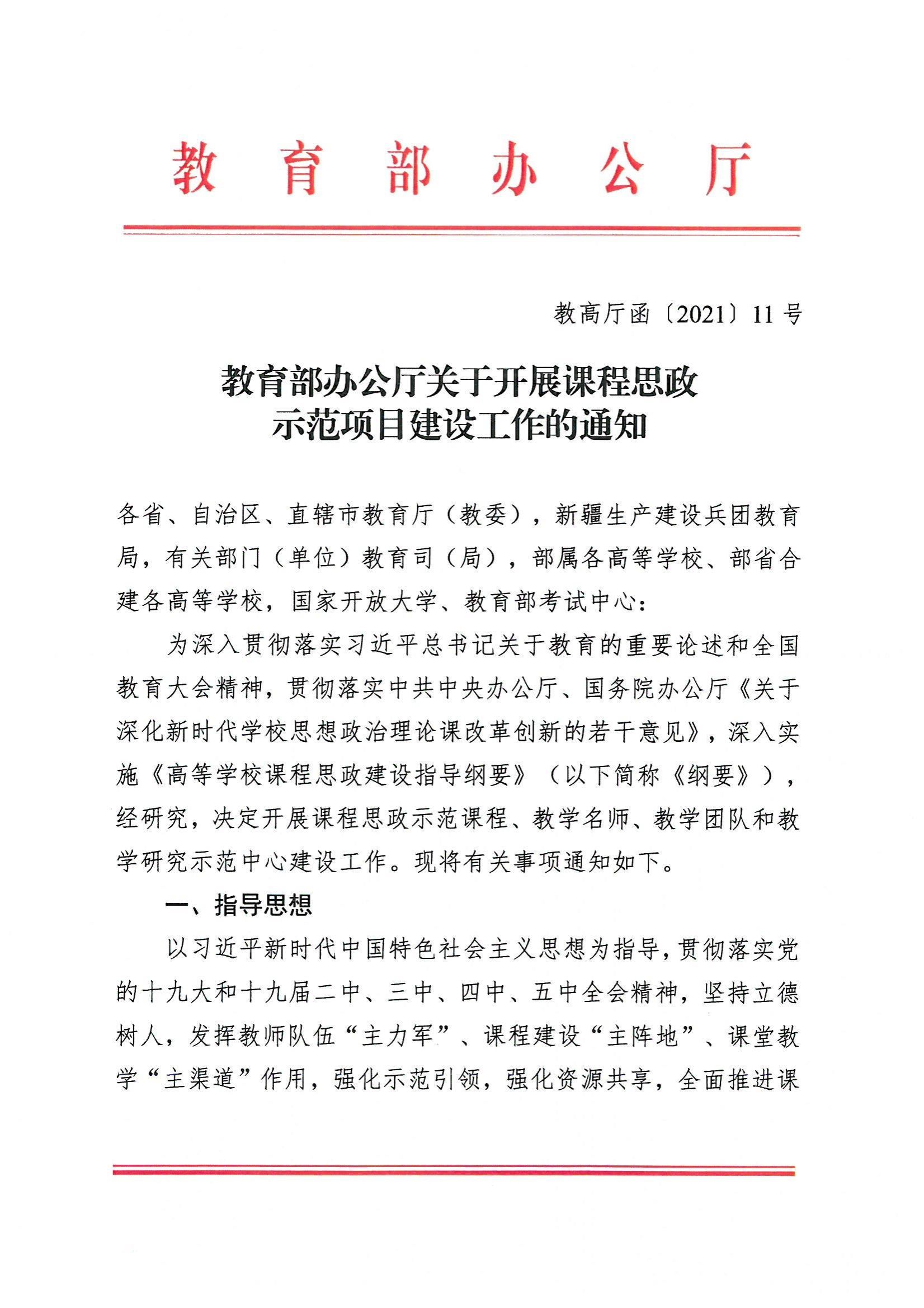 现将《教育部办公厅关于开展课程思政示范项目建设工作的通知》(教高厅函„2021‟11 号)转发给你们,并就做好我省课程思政示范项目建设工作通知如下。
