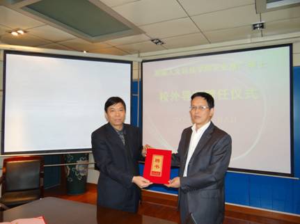 | 校长郭军给校外硕士研究生导师胡绍华颁发聘书