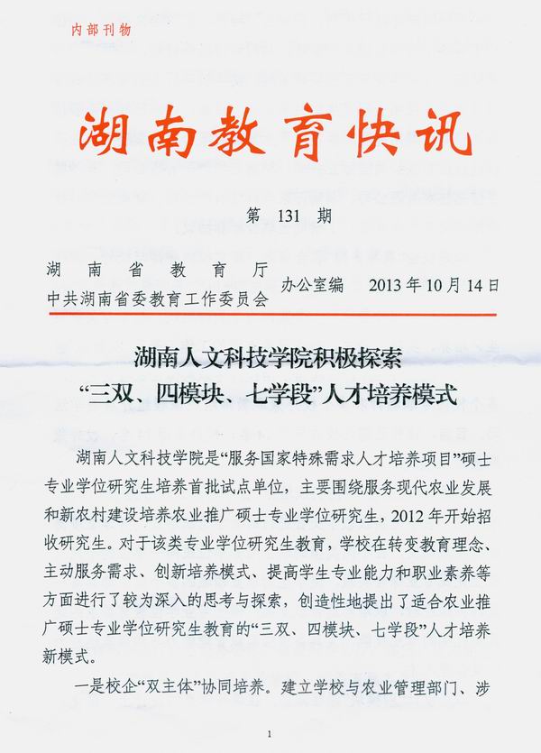 近日,省教育厅内部刊物《湖南教育快讯》以《beat365中文官方网站积极探索“三双、四模块、七学段”人才培养模式》为题,专题报道了beat365独具特色的专业学位研究生培养新模式,并报送到教育部办公厅、省委办公厅,省政府办公厅,莲玉、友志同志;同时发至各市州教育局、各普通高等学校、厅委直属各单位。这是省教育厅对beat365研究生教育办学定位的高度认可,也是对beat365创新专业学位研究生培养模式的充分肯定,更是对转变专业学位教育观念的大力宣传与推介。
