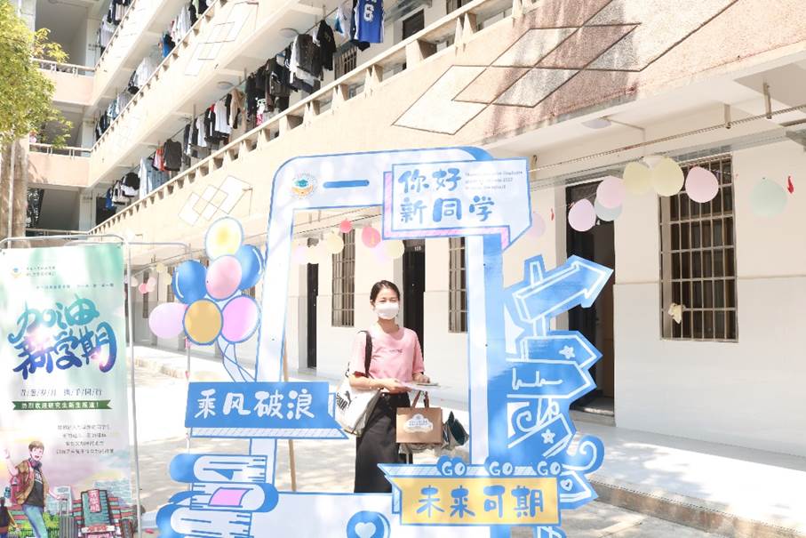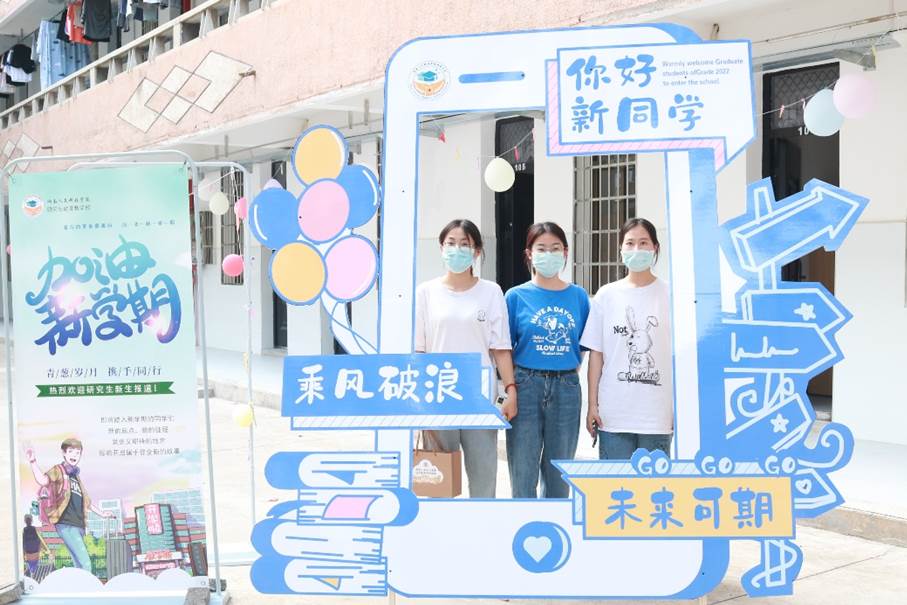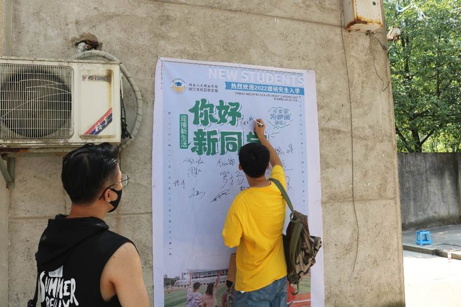 在这次迎新工作中,研究生会组织了20级、21级研究生成立志愿者团队,精心制定了迎新工作方案,提前与新生取得联系,为新生来校、报到、入寝和疫情防控做好服务。研究生宿舍门口鲜艳醒目的欢迎横幅,宿舍楼前学长学姐精心设计的签名墙、创意十足的留影墙以及精美而详实的《新生指南》,无不展现了研究生教育教学部及学长学姐对22级研究生新生们的关心关爱。新生们也纷纷在签名墙上签名、留影墙拍照纪念。