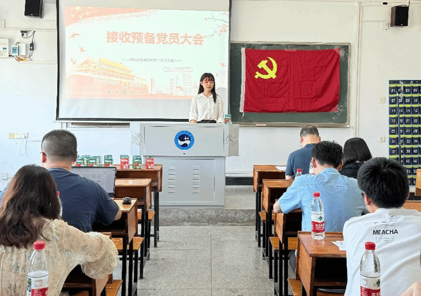 会上,陈敏之等15名入党积极分子依次上台发言,结合自身思想、学习和实践经历,汇报对党的认识、入党动机及成长历程,表达了对加入中国共产党的坚定信念与为人民服务的决心。与会党员认真听取汇报,围绕政治素养、先锋作用等方面展开讨论,并以无记名投票方式全票通过接收决议。随后,在刘康珍书记的带领下,新发展的预备党员共同面对党旗庄严宣誓,铿锵有力的誓词响彻教室。