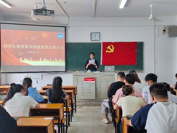 2022年6月16日,研究生教育教学部直属党支部在致远楼411召开了“2022年第四次党员大会”,会议由研究生教育教学部直属党支部书记彭健民主持,全体党员参加。