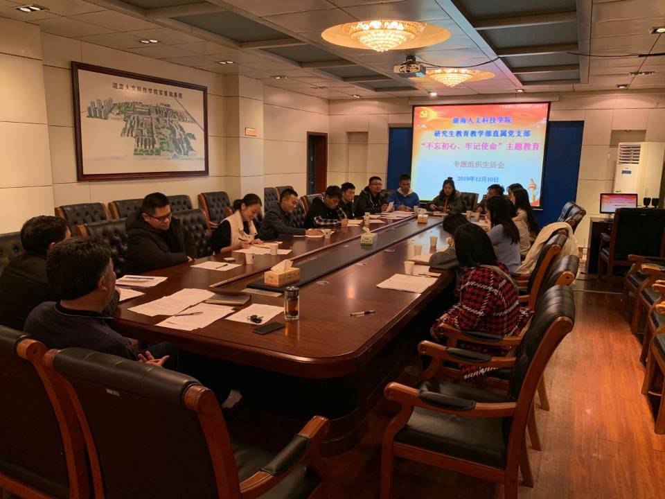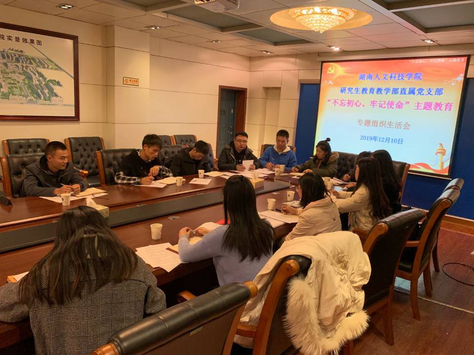 为认真学习贯彻“党的十九届四中全会”精神,以“不忘初心 牢记使命”为主题,严肃认真召开专题组织生活会。12月10日晚上19点半,研究生教育教学部在明德楼405召开专题组织生活会,会议由支部书记彭建民主持。