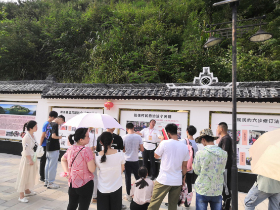 (彭德友在文化墙前给同学们讲乡村治理)