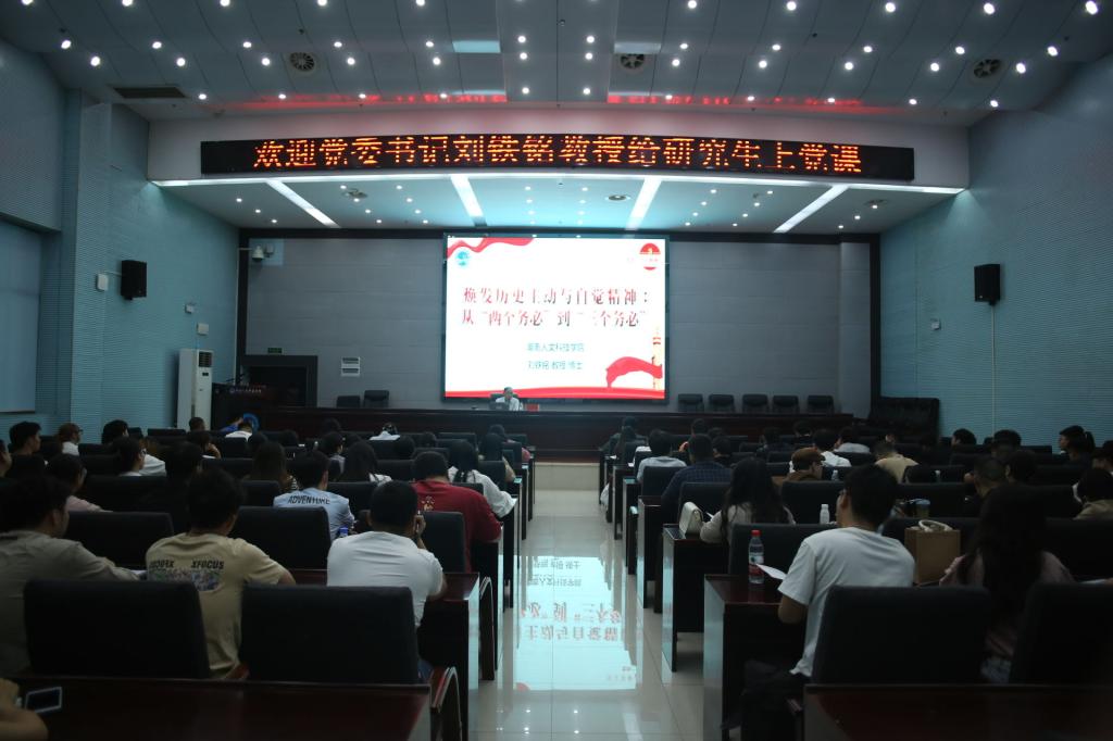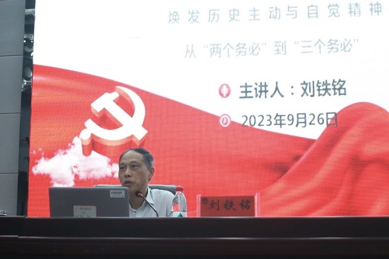 9月26日,党委书记刘铁铭在图书馆二会议室为研究生讲授“焕发历史主动与自觉精神:从‘两个务必’到‘三个务必’”专题党课。党课由研究生教育教学部党总支书记彭健民主持,研究生教育教学部全体师生参加。