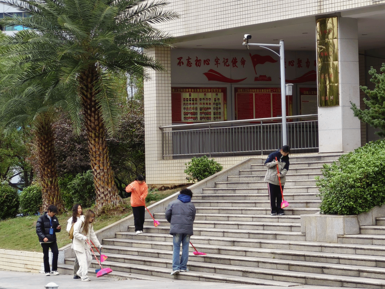 同学们有序清理环境卫生。打扫时,大家拿起扫帚、簸箕等工具,对每个角落彻底清扫。他们用行动展现对校园的热爱,以不怕脏累的身影诠释默契,让教学楼焕然一新。