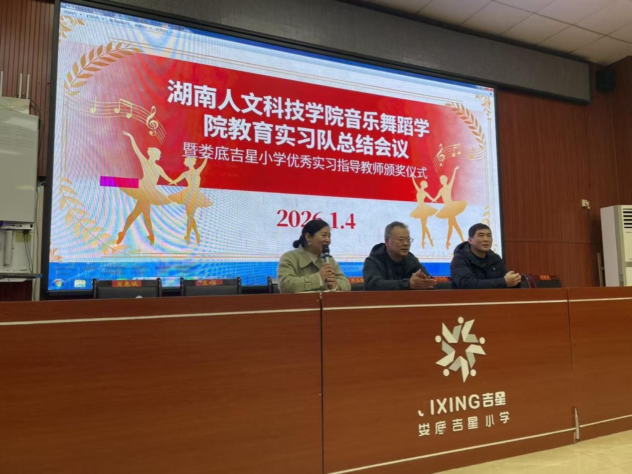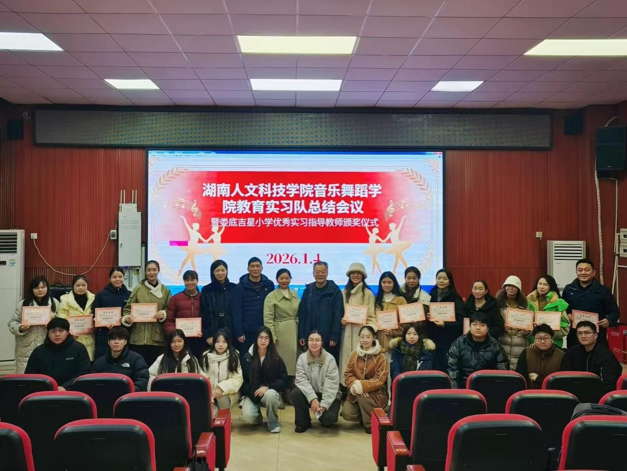 2026年1月4日下午4时,beat365中文官方网站音乐舞蹈学院在娄底市吉星小学隆重举行教育实习总结会议暨优秀实习指导教师颁奖仪式。学院教学副院长颜春英副教授、实习带队教师刘玲博士、吉星小学刘玉怀书记、李伯雄校长、肖飞兰副校长、颜彪副校长、教育实习组长亢景兹老师及全体实习指导教师,与音乐舞蹈学院14名大四实习生共同参与了本次活动,为一段历时四个半月的教育实践之旅画上圆满句号。