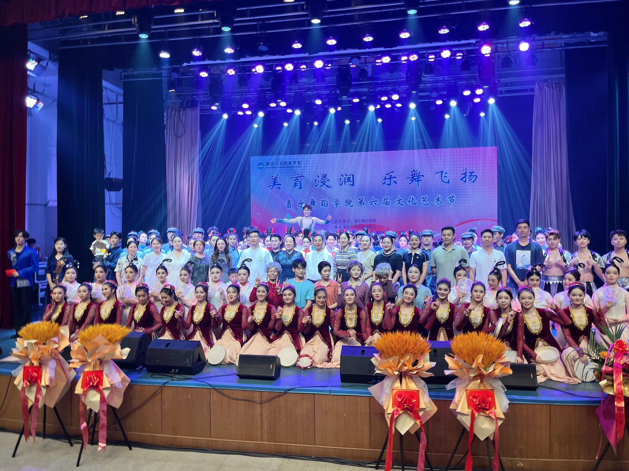 演出结束后,演员与工作人员在舞台合影留念,定格美好瞬间。此次文化艺术节不仅为音乐舞蹈学院的学生提供了展示专业技能的平台,也充分体现了学院在美育教育方面的成果。通过舞蹈艺术浸润心灵,丰富了校园文化生活,促进了艺术文化的传承与创新,获得了现场观众的一致好评。领导嘉宾们的到来,更是对学院艺术教育工作的重视与肯定,激励着学院师生在艺术道路上不断探索前行,为推动校园文化建设和艺术教育事业发展贡献更多力量。