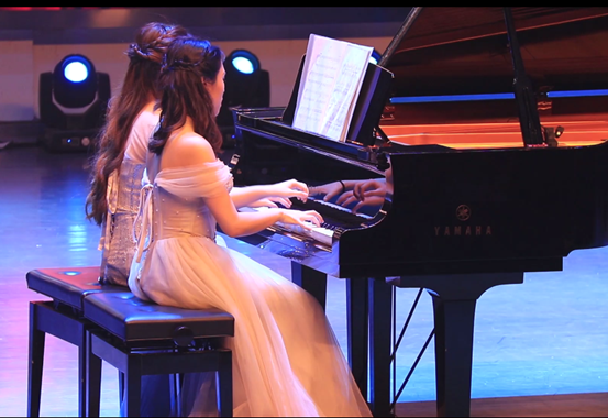 紧接着是张琪、岳芳为我们带来的四手联弹《天空之城》、《湘伦小雨》,我们深深地沉醉在了她们的演奏中。