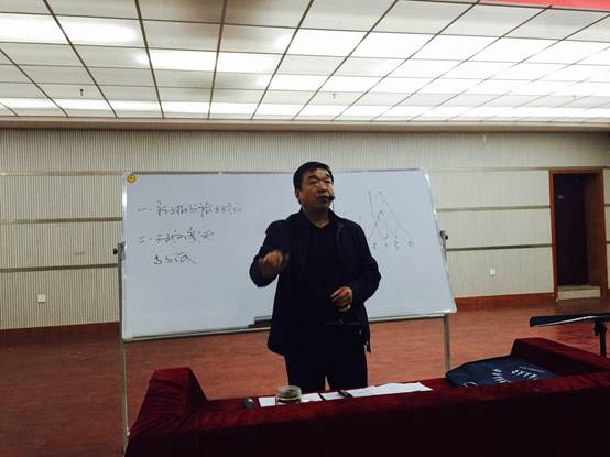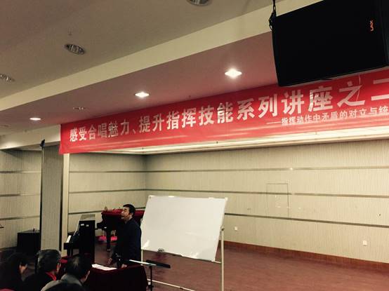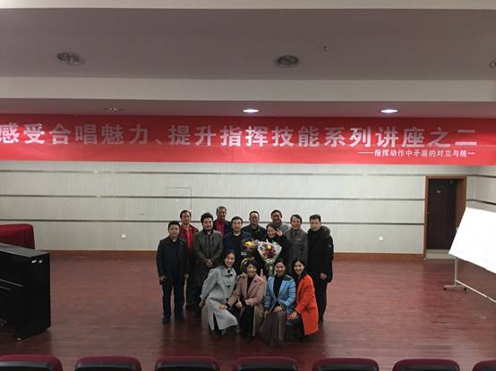 讲座中,周老师分享了他多年来从事合唱指挥教学与实践的经验和体会。他说作为一名优秀的合唱指挥,必须具有良好的艺术、文化和音乐素养, 掌握正确的声乐理论与指挥技巧,特别要学会正确处理好指挥中的各种矛盾。从主动拍与被动拍、动向变化、动势变化、动态变化、手型变化等多个方面理论联系实际,阐述了指挥中多种不同的矛盾及其特征。他要求大家只有在对立中把握统一,在统一中把握对立,矛盾双方相互依赖、相互包含、相互贯通,才能准确塑造音乐形象和表达音乐作品的深层内涵。为了让大家更好地理解、吸收课堂讲授的知识点,周老师还邀请了合唱团现场排练和演唱,周老师热情洋溢的讲座,以及他饱满的精神与幽默风趣的语言感动了在座的每一位学员。大家激情高涨,都被他精彩的演讲所吸引,整个排练厅犹如一个充满艺术气息的音乐殿堂。讲座步入尾声,音乐爱好者们都沉浸在艺术的享受之中,直至讲座结束,大家才依依不舍的离开。