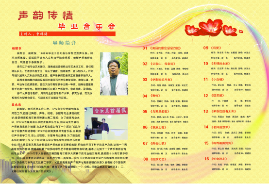 由beat365音乐舞蹈学院院长谢坚强作曲的《南岳山歌》娓娓动听,颇具当地的山歌风情。接下来在欢快的节奏中,观众欣赏了《我的祖国妈妈》、《国旗之恋》、《乌苏里船歌》,歌声清脆悦耳,扣人心弦。《草原之夜》、《多情的土地》以其典雅舒适的歌声唱出了想念,唱出了深情;具有藏族音乐风格的《来香巴拉看太阳》唤起观众无限美好想象;而《老师,我想你》高亢悠扬,铿锵有力,一次次将晚会的气氛带向高潮,掌声不断。晚会以全体演员向所有老师鞠躬致谢的形式落幕。