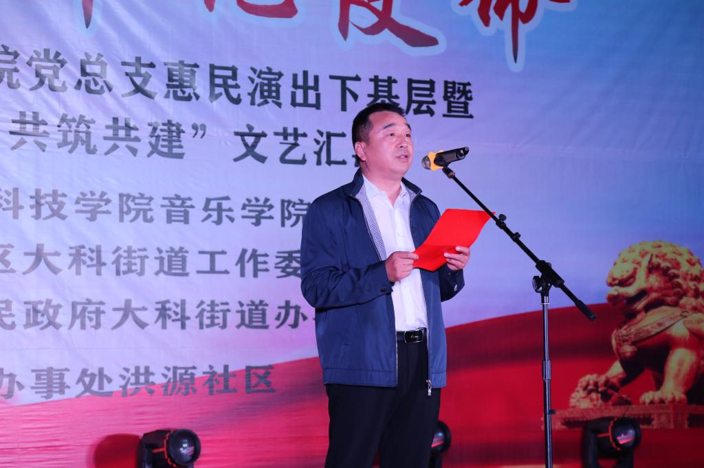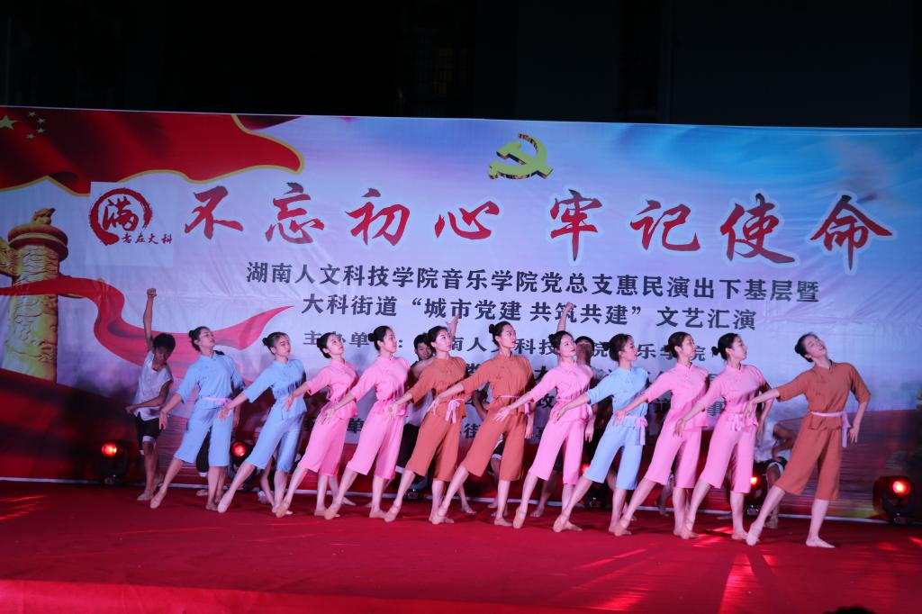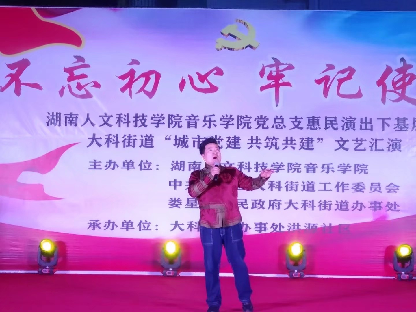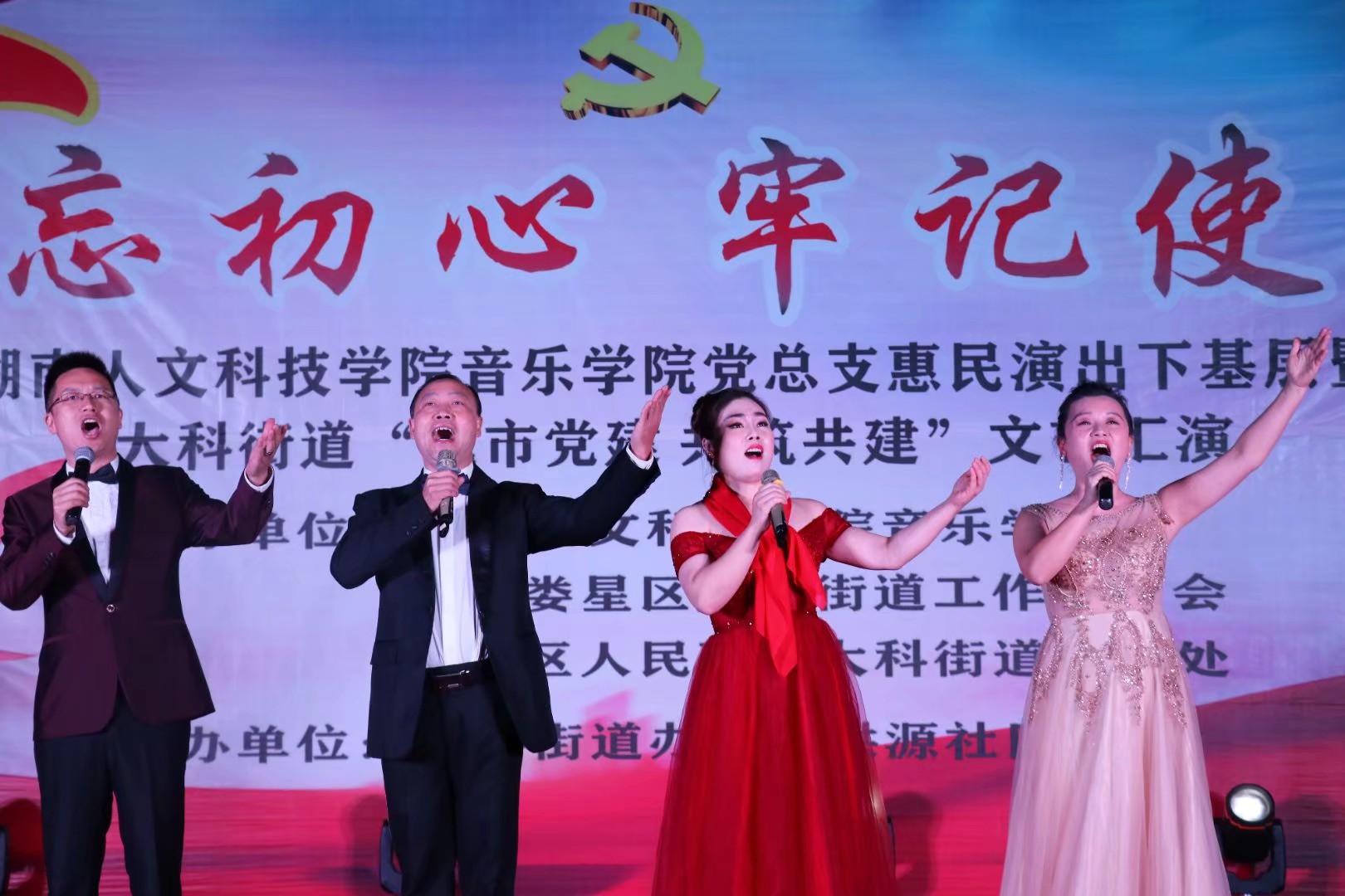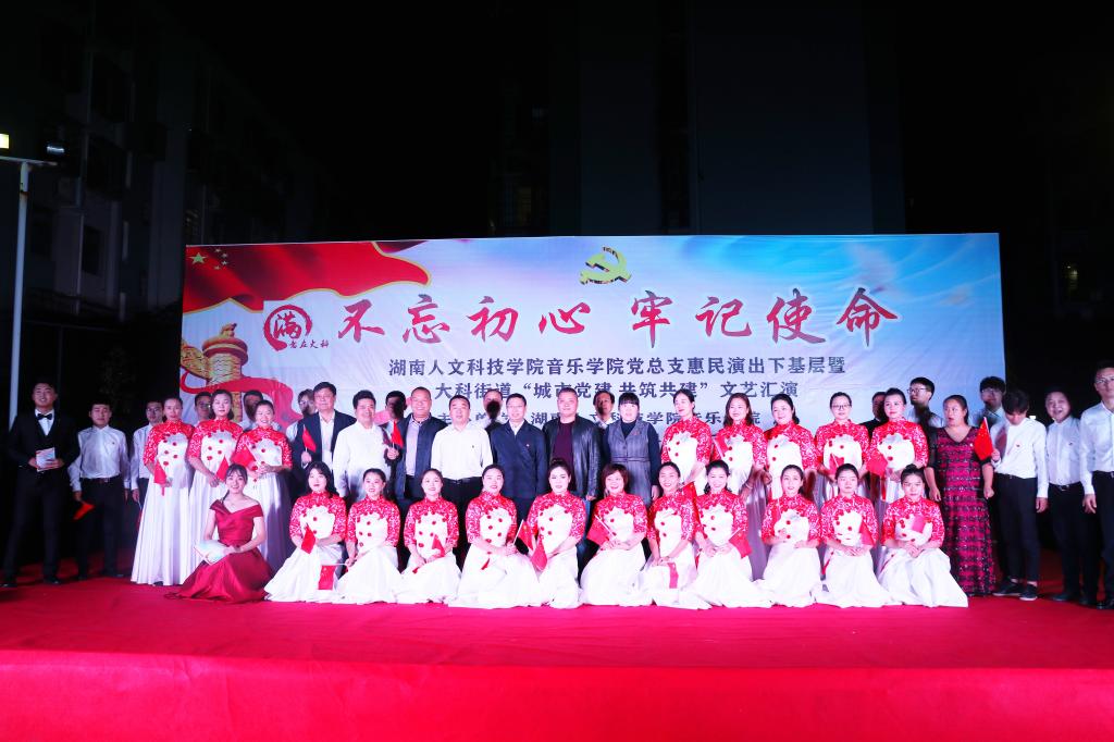 10月29日晚七点半,由中共beat365中文官方网站音乐舞蹈学院党总支部举办的“不忘初心、牢记使命”文艺汇演在娄底市娄星区大科街道办事处洪源社区举行。beat365中文官方网站组织部常务副部长罗求实、机关党委书记刘纲华、宣传统战部部长陈璐、音乐舞蹈学院党总支书记周邦春、副书记邓莉立、副院长吴扎拉·涛、副院长刘利连及洪源社区领导代表出席本次活动。音乐舞蹈学院全体师生党员及部分学生群众共同为洪源社区的父老乡亲们奉上了一台精彩的红色演出。