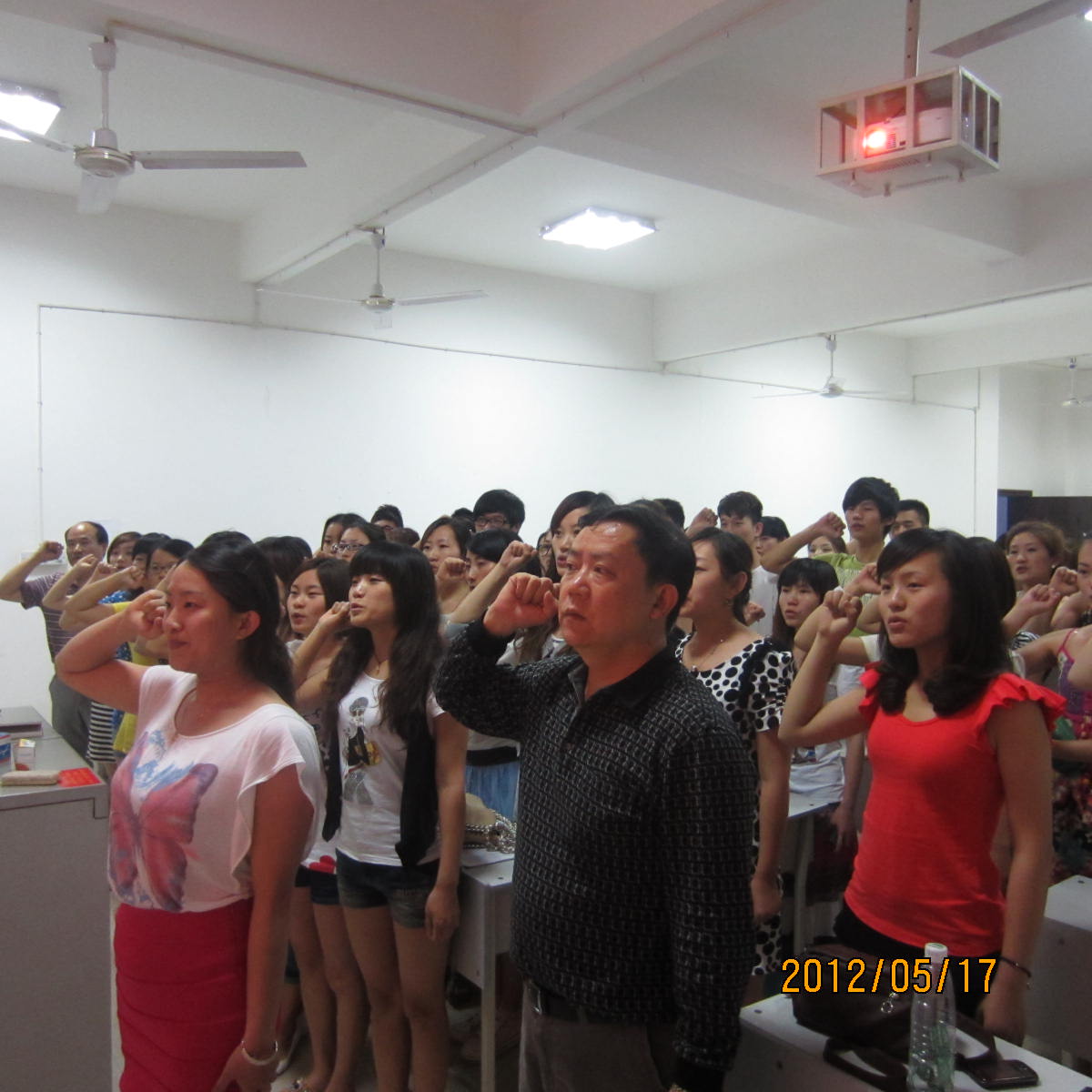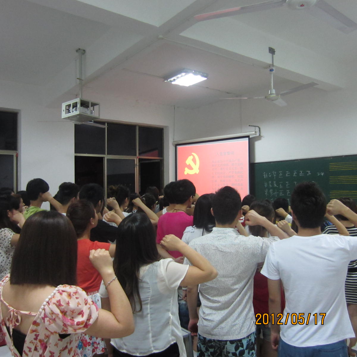 音乐系毕业生党员于2012年5月17日晚在逸夫楼304集体重温入党誓词,音乐系党总支梁陆卿书记要求全体毕业生党员牢记党员使命,站好最后一班岗,起好模范带头作用;音乐系党总支刘盛愚副书记要求毕业生党员在离校期间不仅自己要做好,还要监督和帮助其他同学,一起做到文明离校、安全离校。全体毕业生党员大声朗读入党誓词,纷纷表示要在离校期间做好表率,不辱使命。
