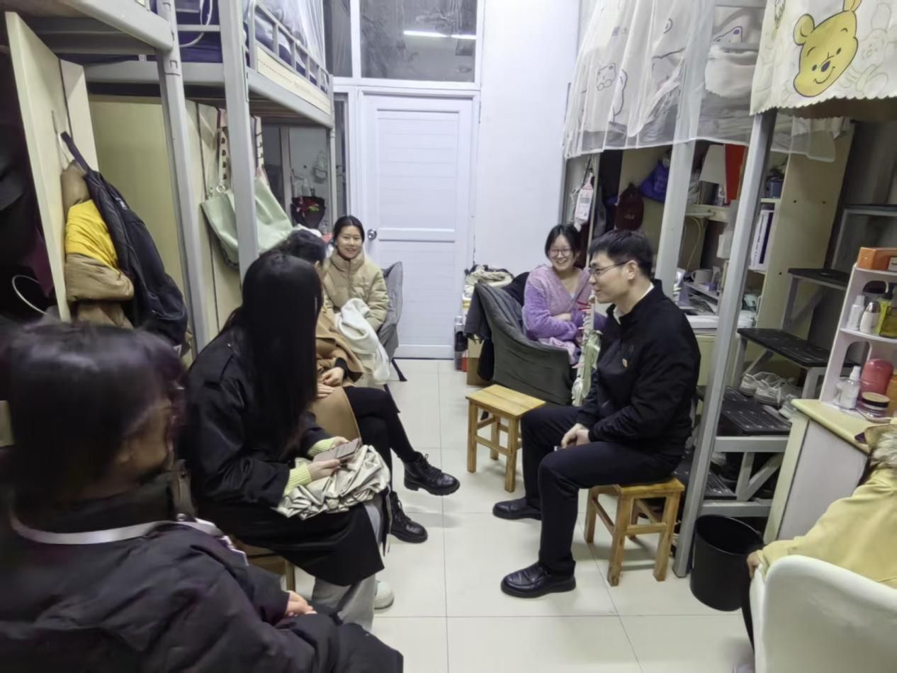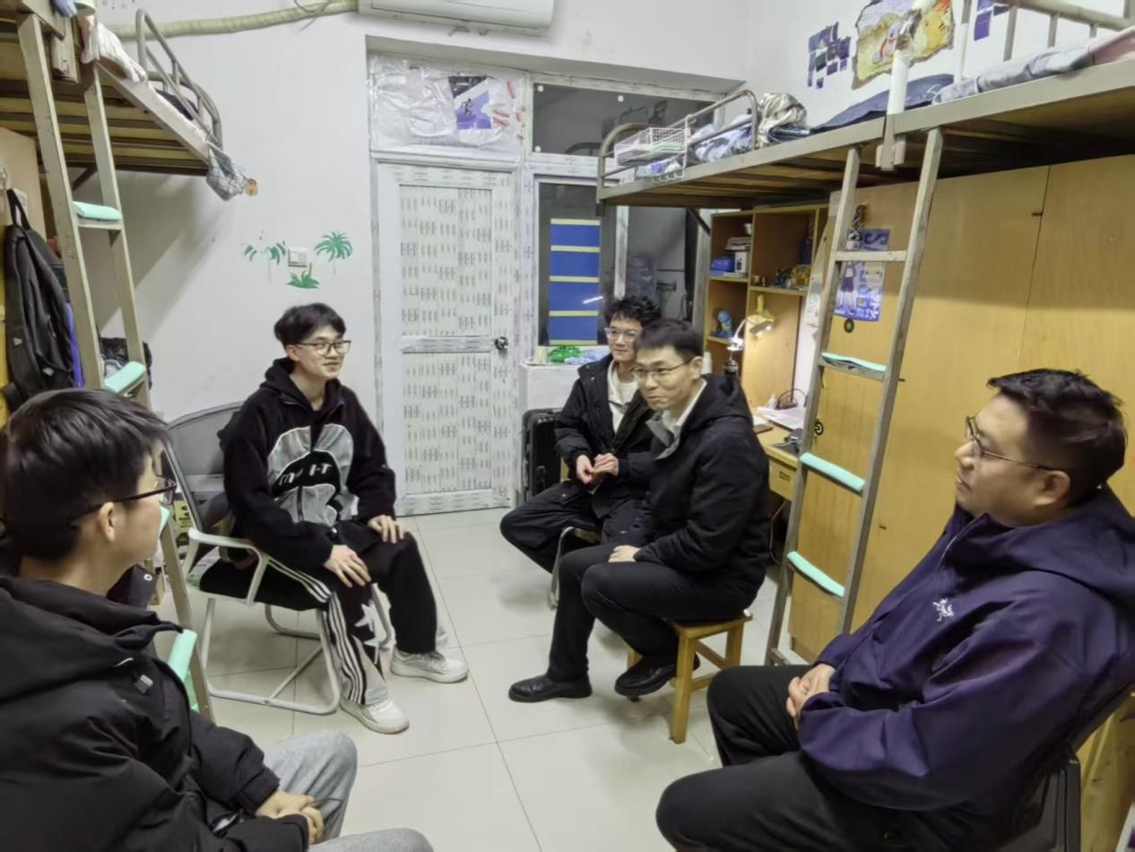 谭峰亮一行先后走访了8栋、13栋、14栋、阳光公寓4栋、阳光公寓5栋等学生宿舍,与学生交流学习生活情况、就业创业、未来发展规划以及遇到的困难和问题,并认真听取了学生对学校工作的意见和建议。