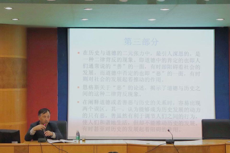 在讲座中,赵炎秋教授首先从人道主义作家狄更斯笔下的监狱入题,讲述了文学作品中历史与道德这两个维面的常见冲突,接着又以作家柳青的作品《创业史》为例,进一步阐述了兼顾历史与道德的二元张力可以使作品的文学价值得到最大体现的观点,此外,赵教授还援引狄德罗的著作《拉摩的侄儿》,为大家介绍了如何在文学作品中正确处理历史与道德的相互关系,并指出文学作品取得成功的重要因素是历史与道德二力的背反。