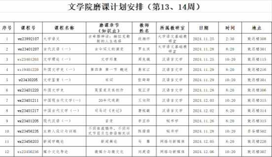第13、14周的教学重点依旧是磨课。磨课期间,各教研室围绕各位老师的磨课内容进行了深入的评课和反复的打磨。活动从教案设计、教学方法的优化,到课堂互动的强化,每个环节都经过了多轮次的反思和调整。第13周、14周的磨课安排如下表: