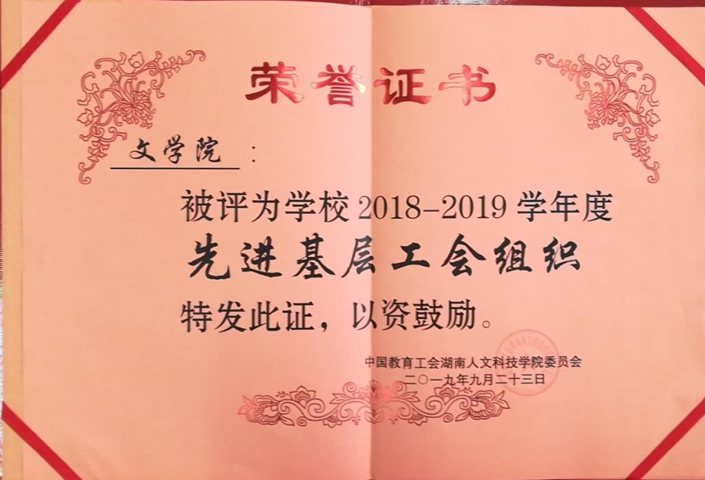 近日,从学校总工会传来喜讯,文学院分工会荣获“2018-2019年度先进基层工会组织”荣誉称号。