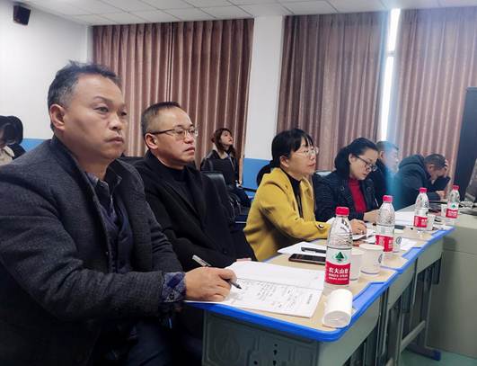 (图为学校领导、学科带头人、语文教研组组长听课评课)