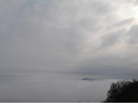 第三站是大熊山顶,雨天的大熊山云雾缭绕,宛若仙境,正如宋庭珪《二月二日出郊》中“天忽作晴山卷幔,云犹含态石披衣”。翘望,连绵起伏的山峦上,一座座白色的风车与蓝天呼应,和谐亲昵;远眺,远处,奇山兀立,直插天池,苍龙仰首,气势非凡。同学们纷纷赞叹大自然的鬼斧神工,心中肃然起敬,唏嘘人类的渺小。
