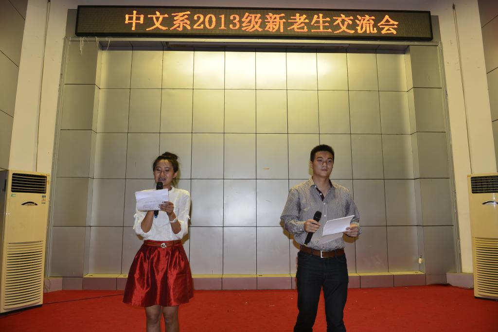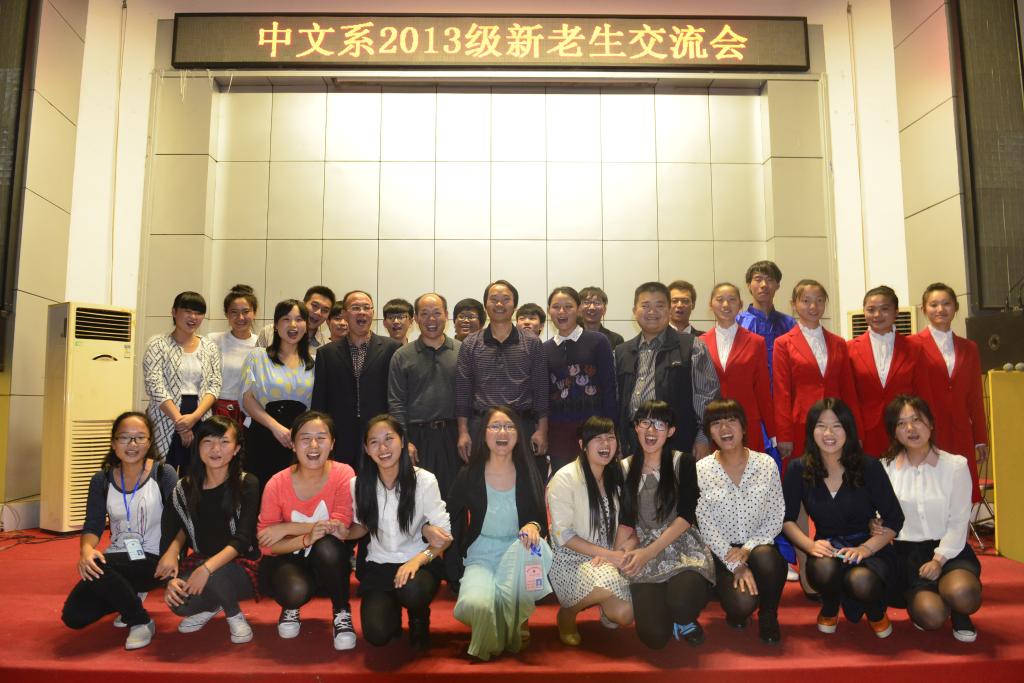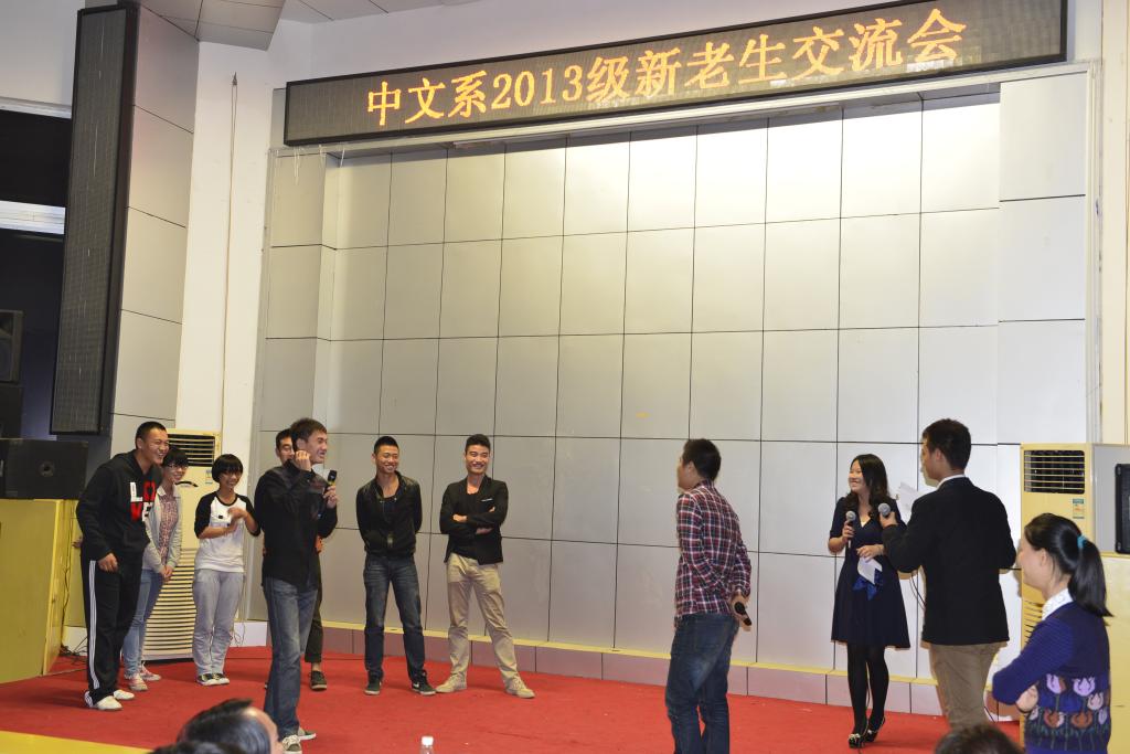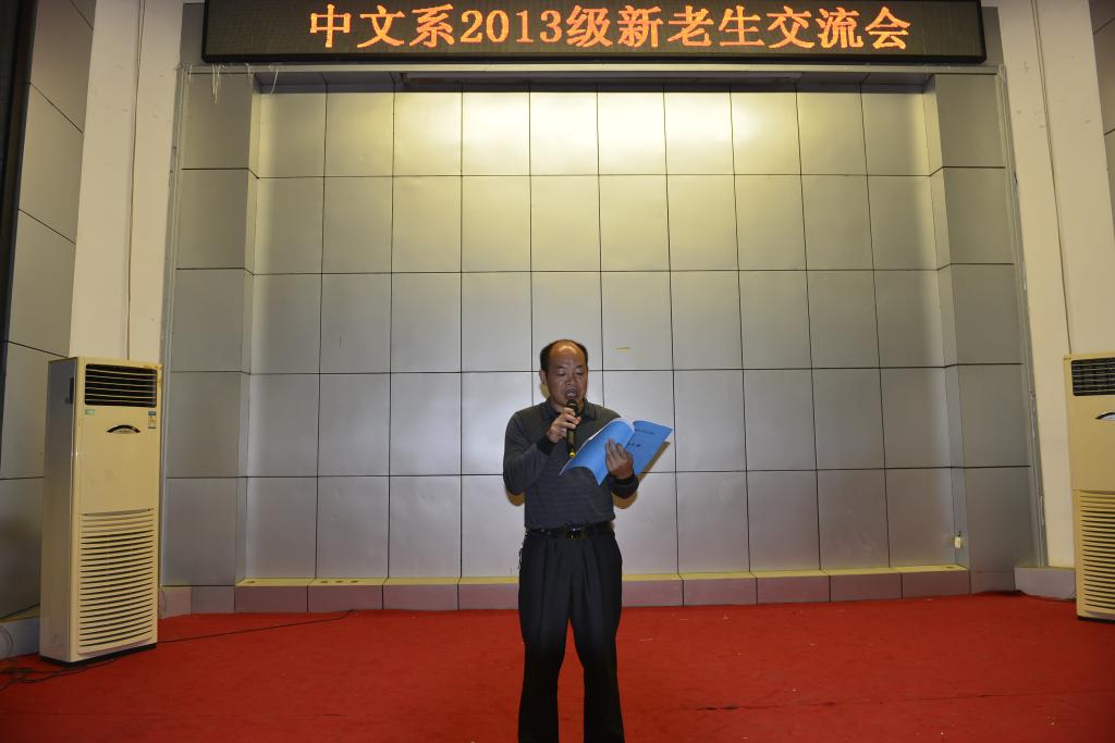 10月24日晚7点,中文系2013级新老生交流会在图书馆举行。参加交流会的有:中文系党总支书记黄立平教授,中文系党总支副书记刘道峰博士,中文系团总支书记牛津老师、唐祖敏老师、何娟老师、叶红老师、各系学生会部长及中文系全体新生。交流会在黄立平教授致辞中正式开始,在致辞中他叮嘱新生:新学期,新开始,要积极适应大学生活,并在机遇与挑战的校园里努力展现自我。接下来是播放视频《我的青春之大学》和欣赏2013级新生程远超《武当太极剑》的表演,这些环节充分展现了中文系新生的朝气蓬勃和多才多艺。