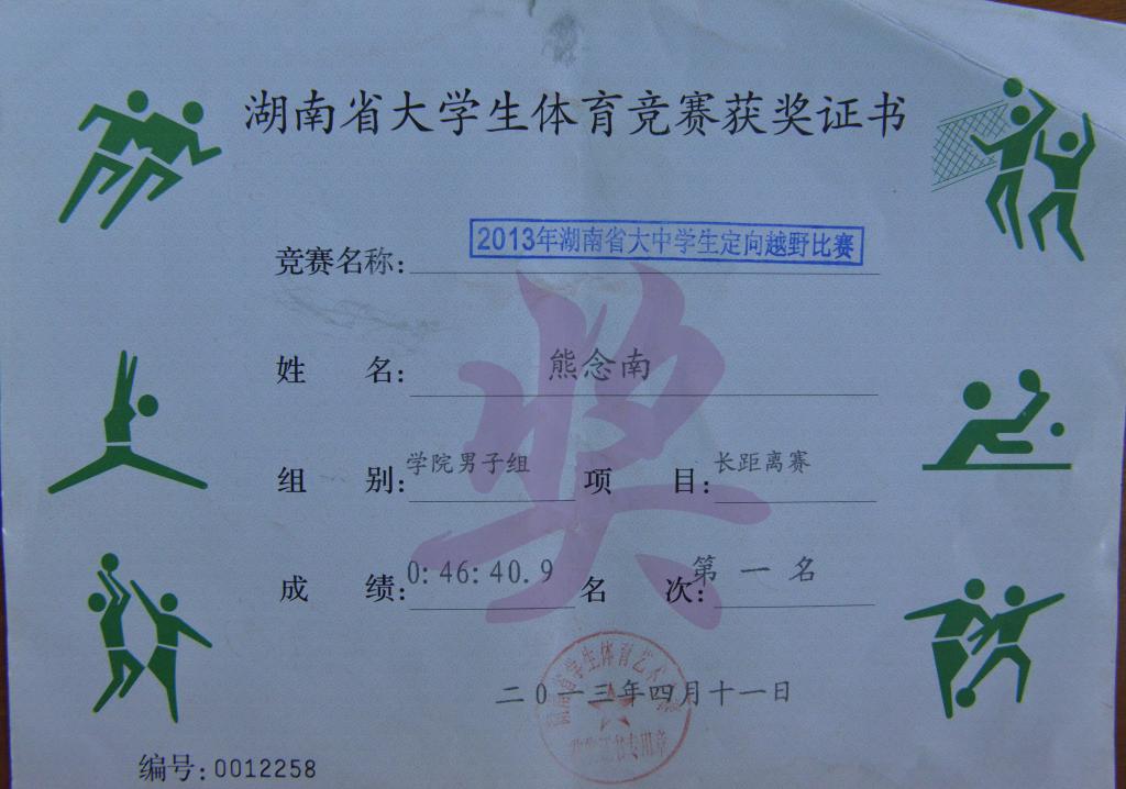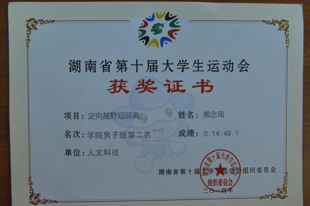 熊念南 ,出生于1993年7月,湖南省益阳人,beat365中文官方网站中文系2012级语教专业学生,国家定向越野高水平运动员。曾获多项荣誉:在2013年湖南省大中学生定向越野比赛中,荣获学院男子组长距离赛第一名;在2013年8月举办的全国学生定向越野锦标赛中,荣获高校精英组男子第三名;在2014年湖南省第十届大学生运动会定向越野短距离赛中,荣获学院男子组第二名;在2014年全国定向锦标赛中,取得了成年男子精英组第六名等。