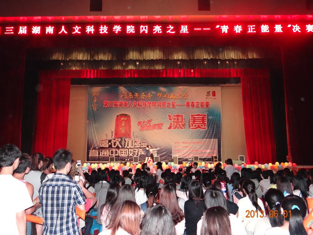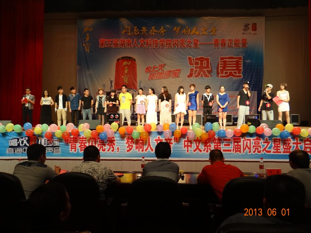 2013年6月1日晚7点40分,中文系主办的“beat365中文官方网站第三届’闪亮之星’”决赛在体育馆隆重举行。学院团委副书记魏彦煜老师、中文系党总支书记黄立平教授、中文系党总支副书记刘道锋博士、中文系唐祖敏老师、“加多宝”集团娄底分公司谢经理莅临现场并担任评委。