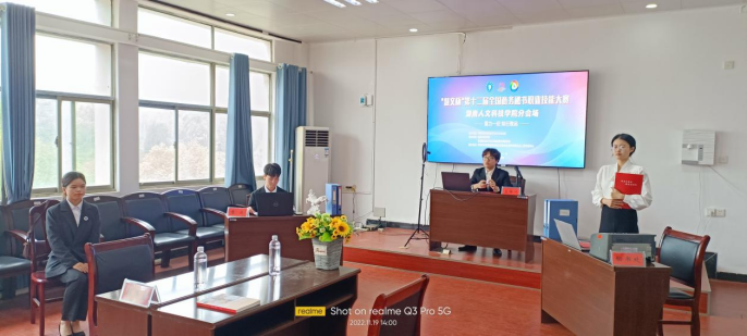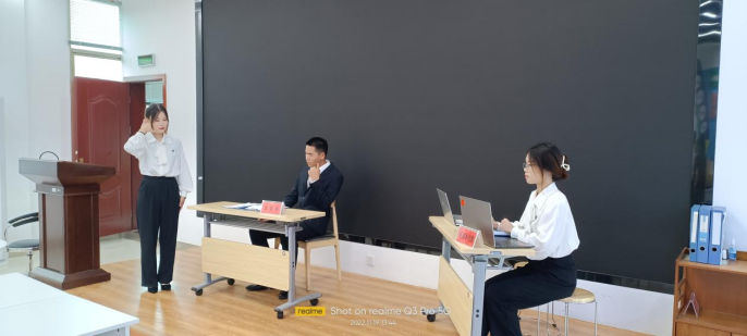 下午2点整,两支队伍分别在致远楼213会议室和若谷楼501融媒体中心进行第二赛项——秘书工作情景展示的比赛。情景展示的基本主题是接待、会议、领导临时交办的事务处理。各参赛队根据给定的基本主题进行展示。张延队的剧目是《“四九”公司产品纠纷事件》。故事以“产品纠纷”危机为题材,剧情新颖,充分体现了秘书不凡的化解危机的能力。徐祯妮队的剧目是《双十一大促事件》。故事以双十一产品大促为背景,展现了秘书们在应对紧急情况时表现出来的专业素养。下午3点30分,两支队伍进行第三赛项——秘书实境工作处理的竞赛。选手两两组合,一位担任总经理,一位担任秘书,总经理对秘书工作做出合理评价。本场比赛考察秘书的宴会安排工作和电话处理,选手们临场发挥,沉着应对,表现出色。