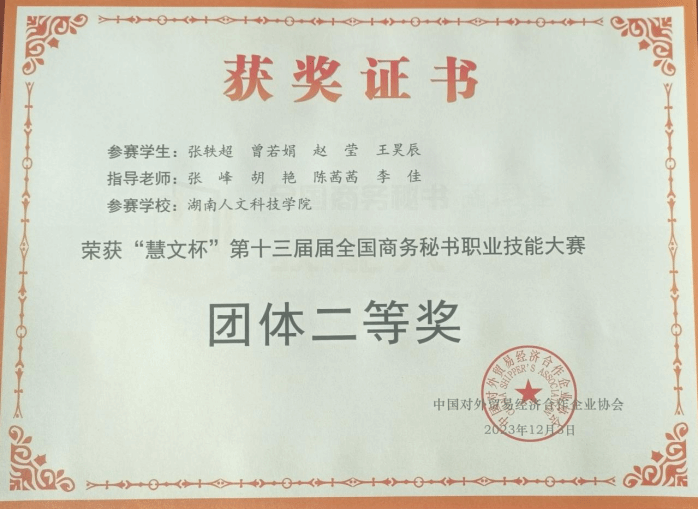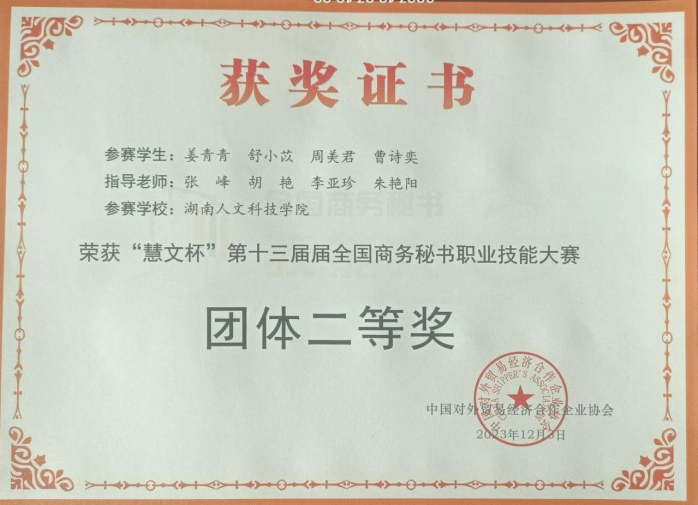 大赛由中国对外贸易经济合作企业协会主办,浙江警官职业学院和全国商务秘书与行政助理专家委员会承办,中国对外贸易经济合作企业协会外经贸从业人员考试中心协办。大赛自2010年已经成功举办了13届,成为迄今为止连续举办时间最长、届数最多、规模最大、影响力持续增长的全国性秘书专业大学生职业技能竞赛。本届大赛是2020—2022年三届线上竞赛后首次恢复现场竞赛。参加此项赛事,对文学院秘书学专业来说,达到了“以赛促教,以赛促学,以赛促建,赛教结合”目的,促进了进专业的进步与提升。