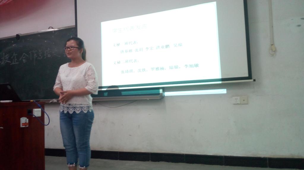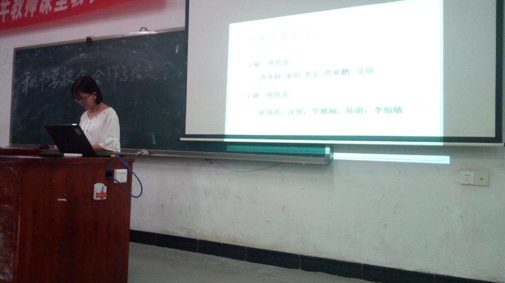 总结大会由秘书学一班的沈铁同学主持。他上台播放了精心制作的PPT。一幅幅精选的图片,勾起了大家对校企合作教育的美好回忆:629日上午娄底市档案馆馆长郭灿远的档案讲座,629日下午学校档案馆的观摩座谈,630日国泰安公司的会务实训,71日下午的即兴演讲训练,72日至4日的会务实训、办公室自动化设备实训、摄影摄像实训、情景剧训练……活动安排环环相扣,紧凑合理,理论联系实际。6天的合作教育实践,给大家留下了深刻的印象。