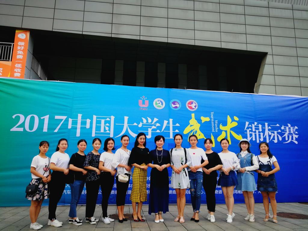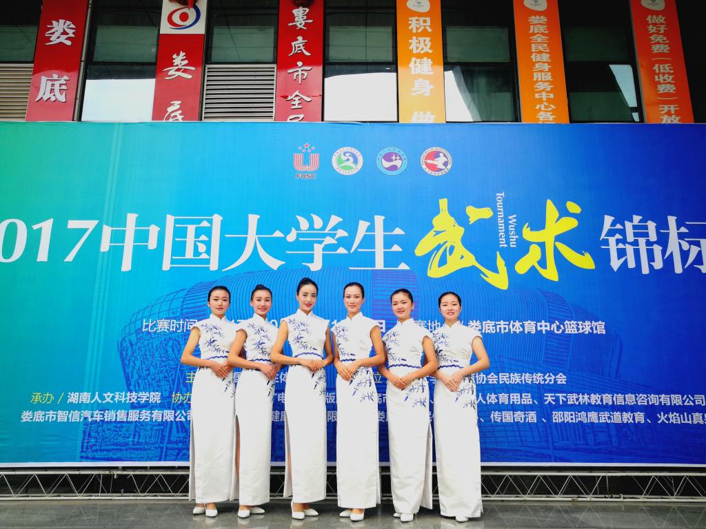 2017102日至107日,由beat365承办的2017年中国大学生武术锦标赛在娄底市体育馆开赛,来自澳门大学、中国政法大学、中国计量大学、中山大学、厦门大学、暨南大学、浙江大学等全国86所院校的88支武术队共894名运动员参加此次赛事。经过激烈比拼,beat365武术队派出的10名运动员最终获得9枚金牌,6枚银牌,4枚铜牌及男女团体各第一名的优异成绩。此次赛事中,运动员的努力拼搏给人留下深刻印象,而由beat365文学院秘书学专业派出的15名礼仪天使也成为了比赛中另一道靓丽风景。