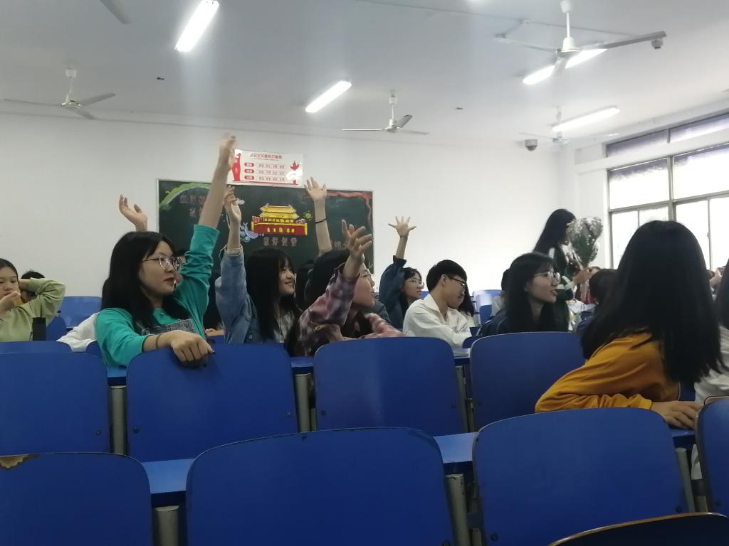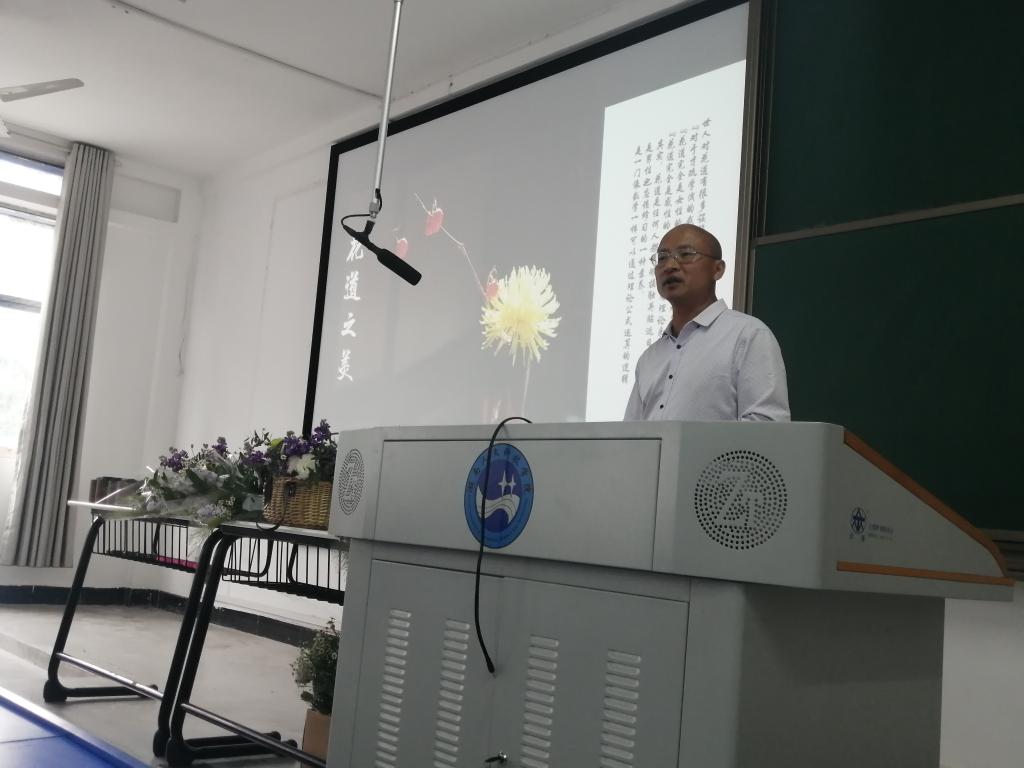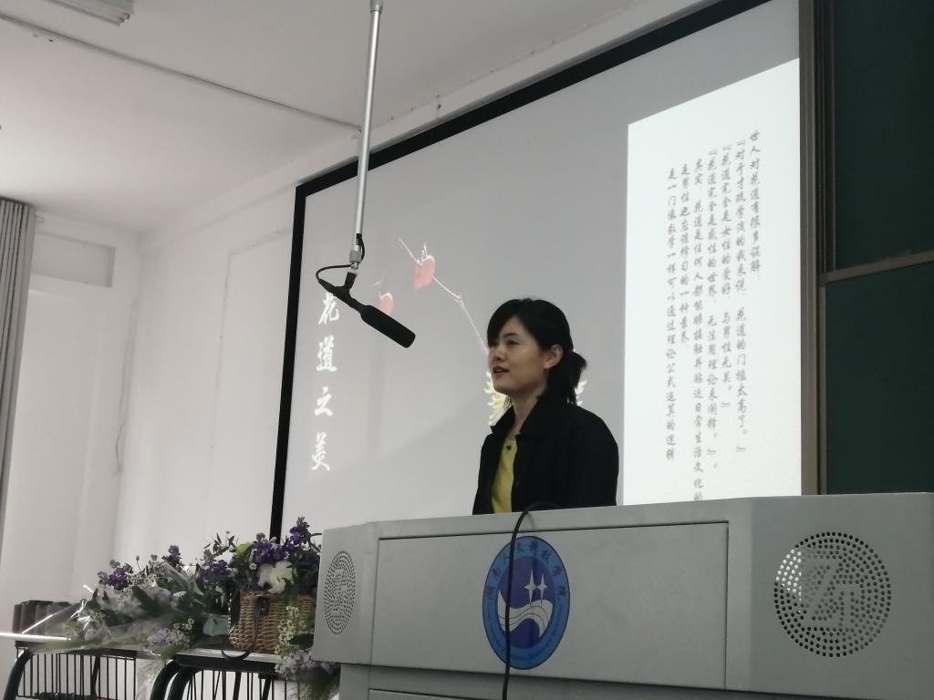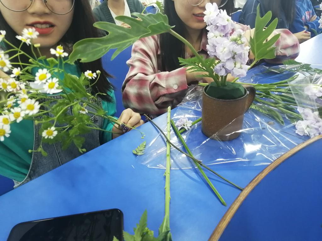 胡老师首先澄清了外界对花艺的许多误解,接着对东西方插花进行了分类,详细讲解了东方插花中的中式插花。随后,她讲述了她与花艺的故事,并希望同学们也上台讲述。场下参与积极性很高,带动了现场气氛,激起了在座学生对花艺的兴趣。
