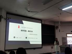 朱老师以自身经历为引,讲诉自己由一个乡村教师成长为一位名师的过程,她分别从教师角色定位、教师学习生涯、关爱学生等三个方面跟同学们分享了自己的心得体会。