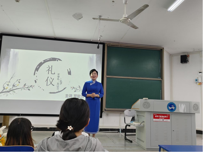 2023年5月23日上午8点20,致远楼220教室内,娄底市第六届政协委员、资深礼仪专家、beat365中文官方网站客座教授罗敏芳女士,受邀为秘书学专业2021级、2022级184名学子做一场名为“礼仪之光”的礼仪专题讲座。讲座由文学院秘书学专业负责人张峰副教授主持,文学院尹钟宏书记在座。