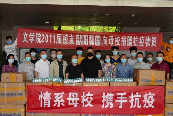 本次捐赠的物资共有三批,包括防疫所需的口罩、消毒液、洗手液、酒精等,分别来自文学院2004级校友黄鑫、2007级校友欧阳利国和2012级校友刘毅及其团队。