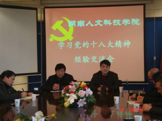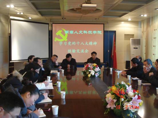 12月18日下午2:30,在明德楼四楼第一会议室召开学习“十八大”精神经验交流会。会议由党委副书记李尚益主持,出席会议的领导有学校党委书记柏连阳,参加会议的主要是党总支部书记(直属党支部书记)、党支部书记代表。