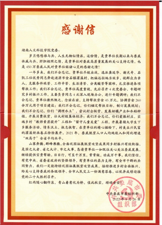 近日,学校收到了一封来自娄底市委组织部的感谢信。信中表达了对学校和驻村工作队近一年多来在涟源市金石镇灌溪村开展乡村振兴工作的高度认可和感谢。