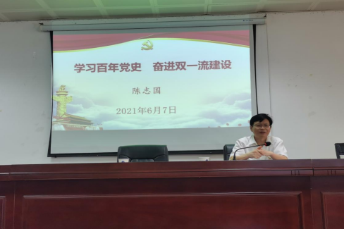 在学校党史学习教育进入第四专题之际,6月7日,在图书馆415会议室,学校党委委员、副校长陈志国教授,为图书馆全馆职工作了一场题为“学习百年党史,奋进双一流建设”专题讲座。讲座由图书馆党支部书记、馆长彭辉主持。
